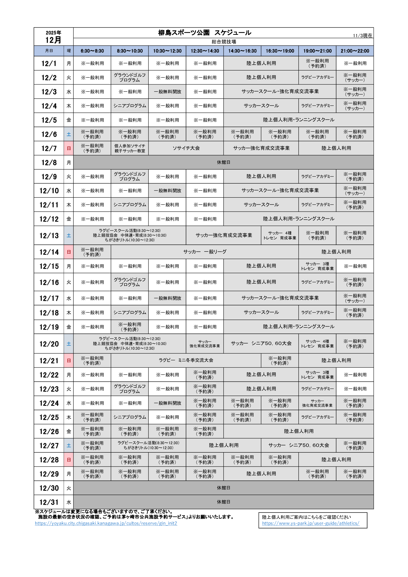2025年12月のスケジュールになります。