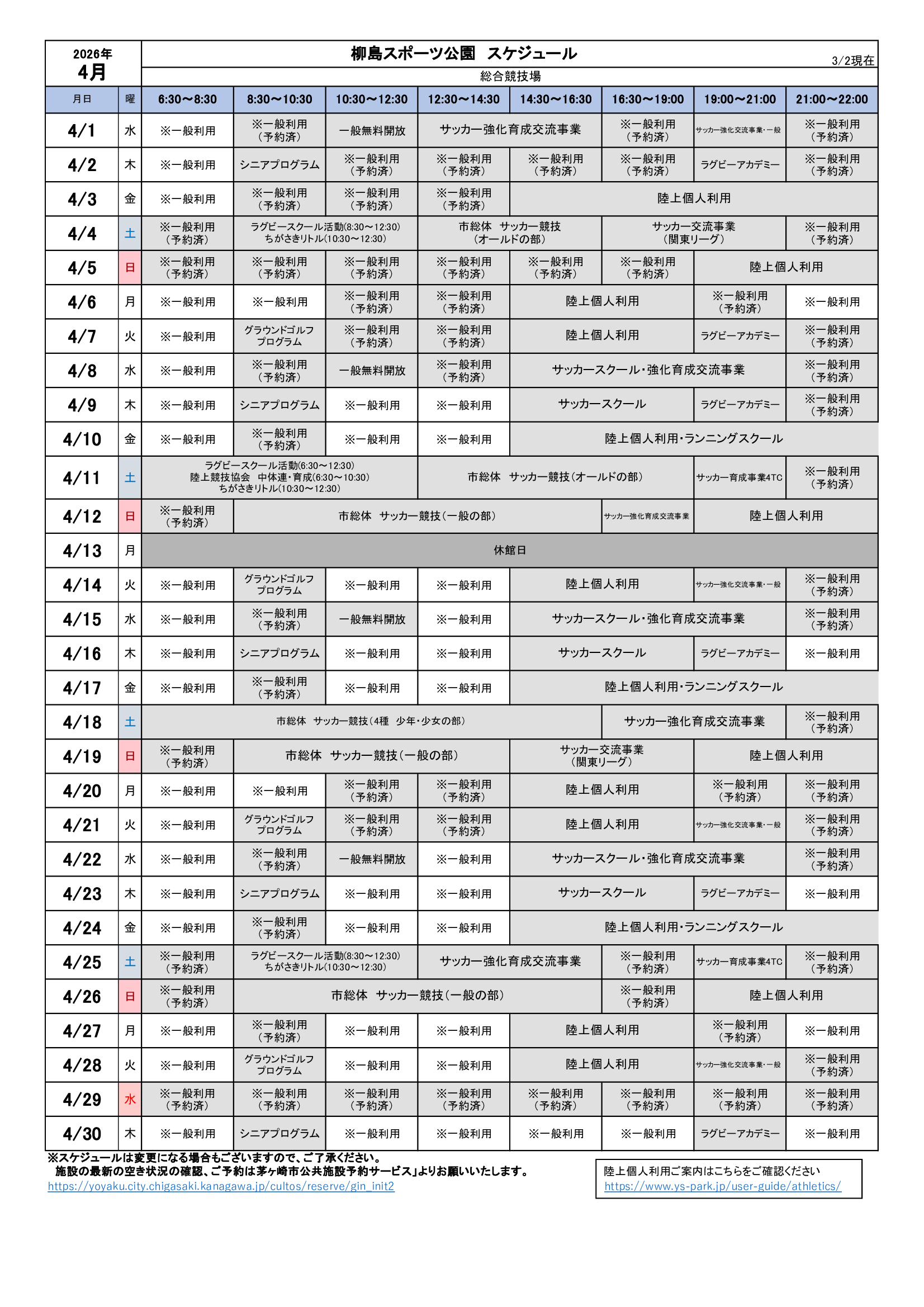 2026年4月のスケジュールになります。