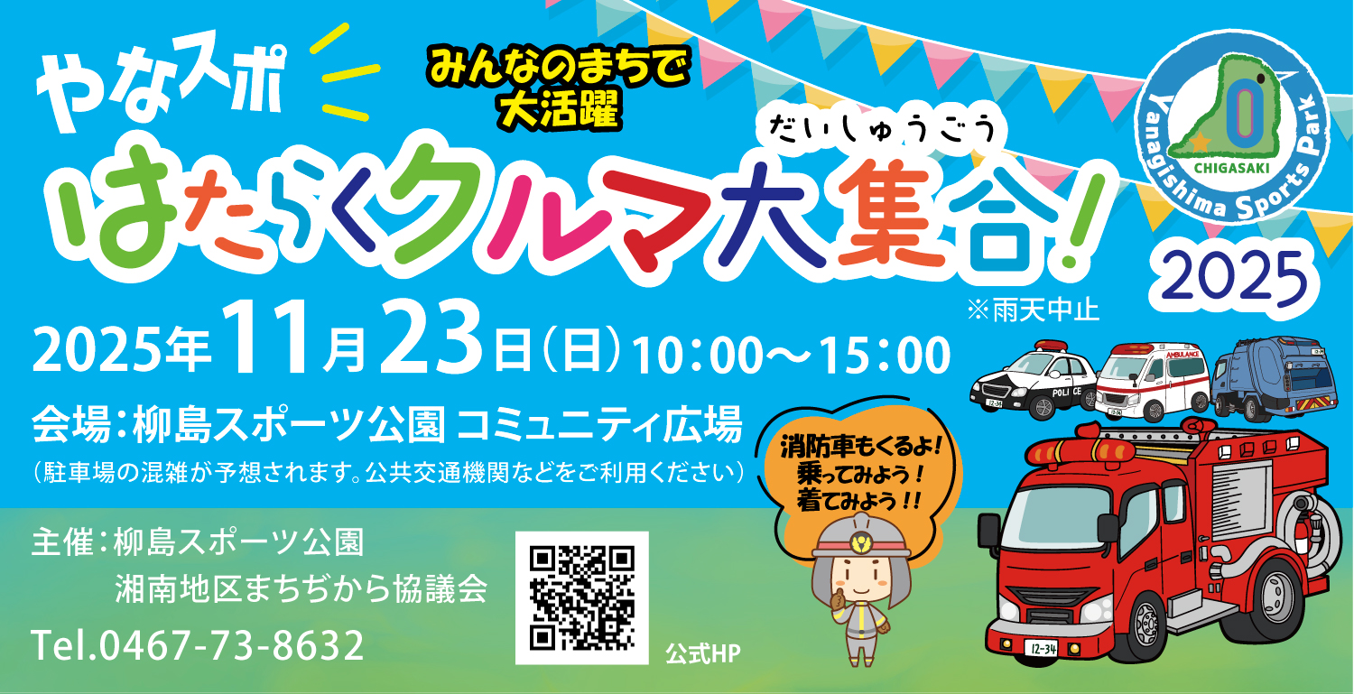 消防車・パトカー・救急車・郵便車など、私たちの暮らしを支える「はたらくクルマ」が柳島スポーツ公園に大集合!