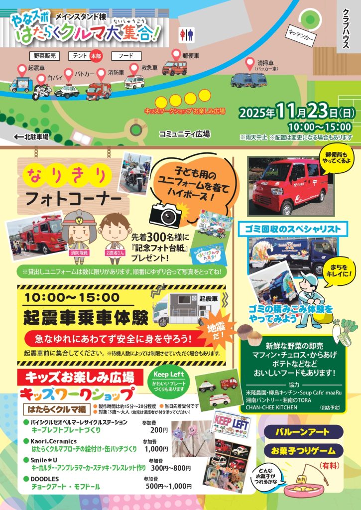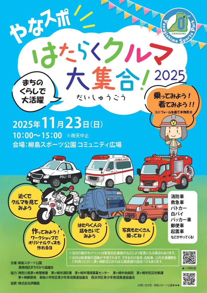 消防車・パトカー・救急車・郵便車・自衛隊など、私たちの暮らしを支える「はたらくクルマ」が柳島スポーツ公園に大集合!実際に車両を見学できるほか、地震体験ができる起震車も登場します。