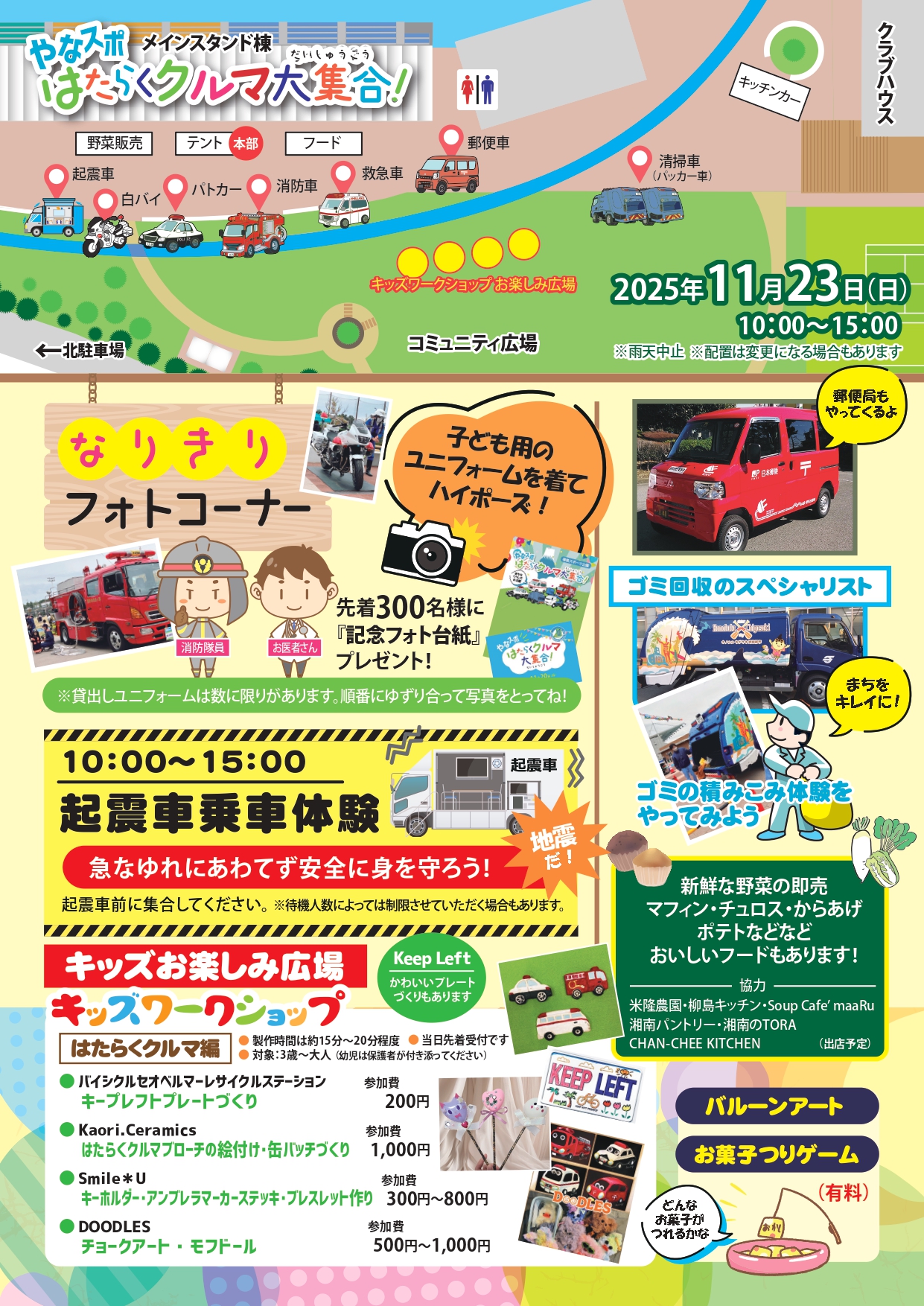 消防車・パトカー・救急車・郵便車・自衛隊など、私たちの暮らしを支える「はたらくクルマ」が柳島スポーツ公園に大集合!実際に車両を見学できるほか、地震体験ができる起震車も登場します。