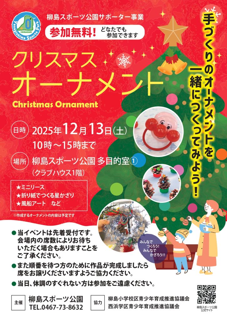 柳島スポーツ公園では、小さな子どもたちでもできるクリスマスのオーナメント作りの企画を準備しています。参加は無料!ぜひ遊びにきてくださいね。