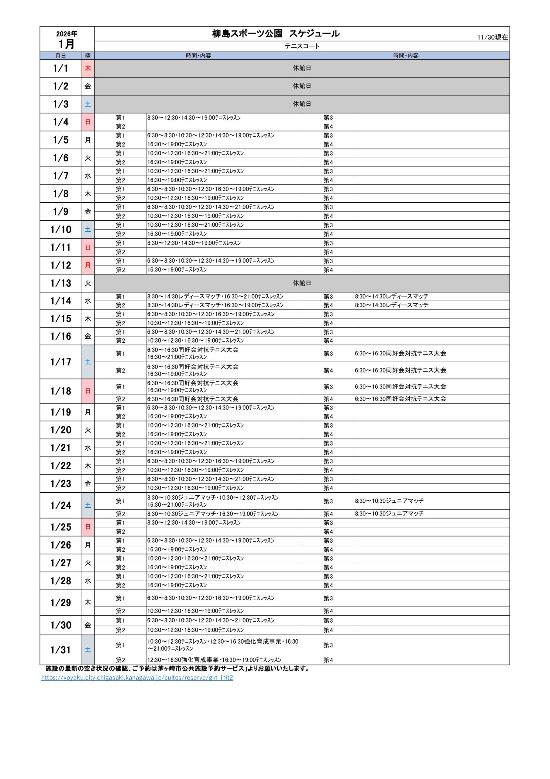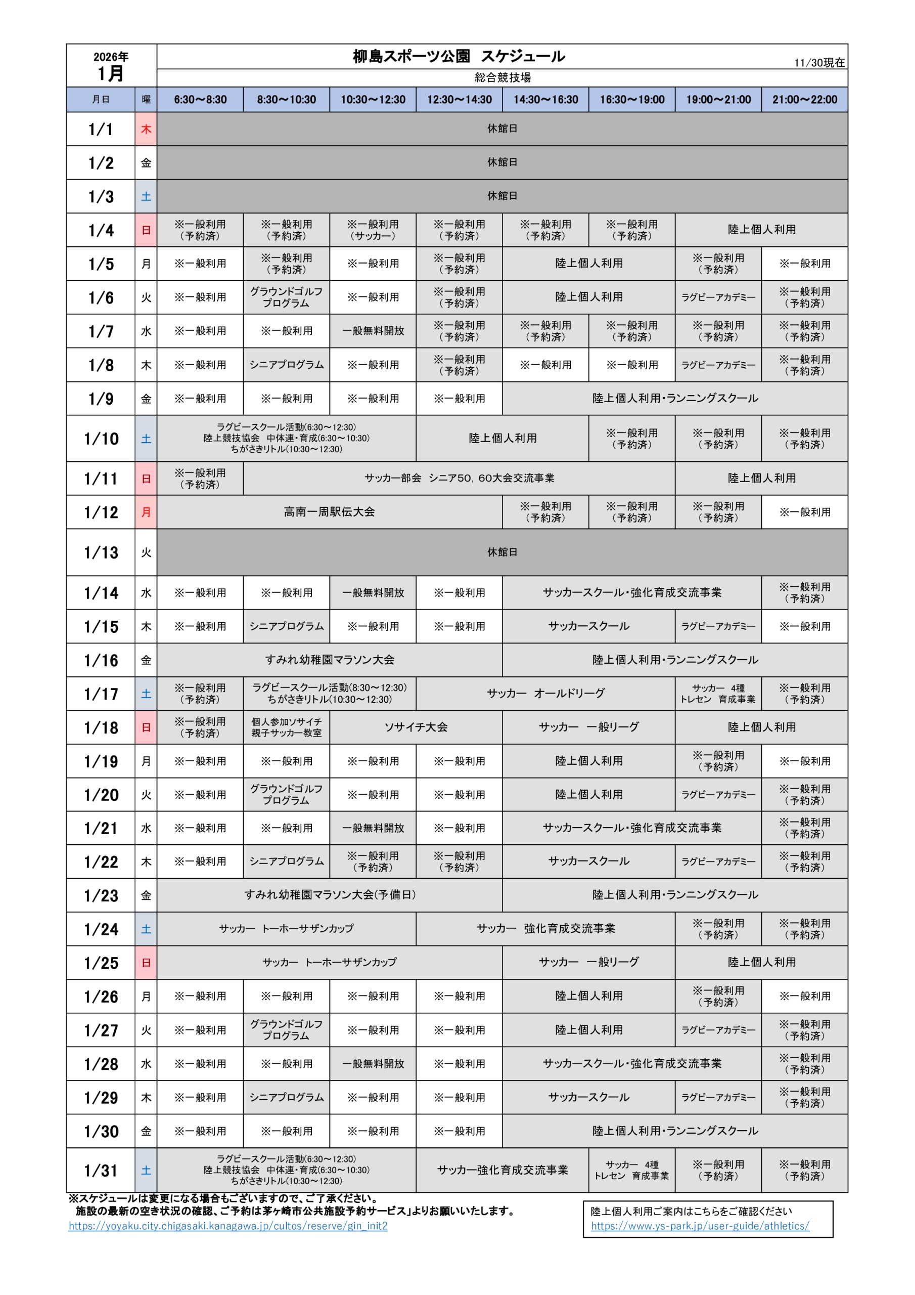 2026年1月のスケジュールになります。