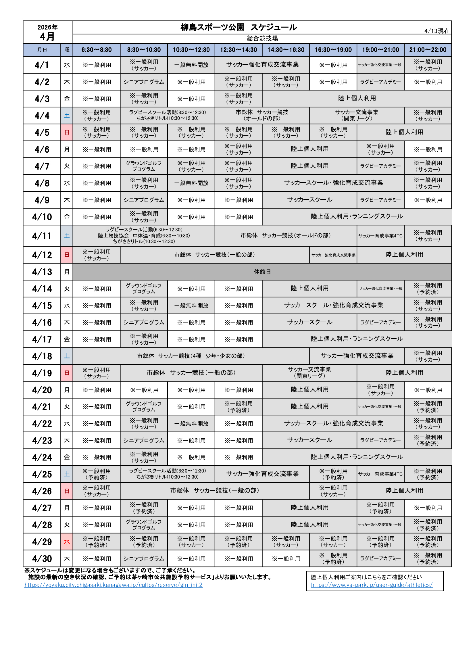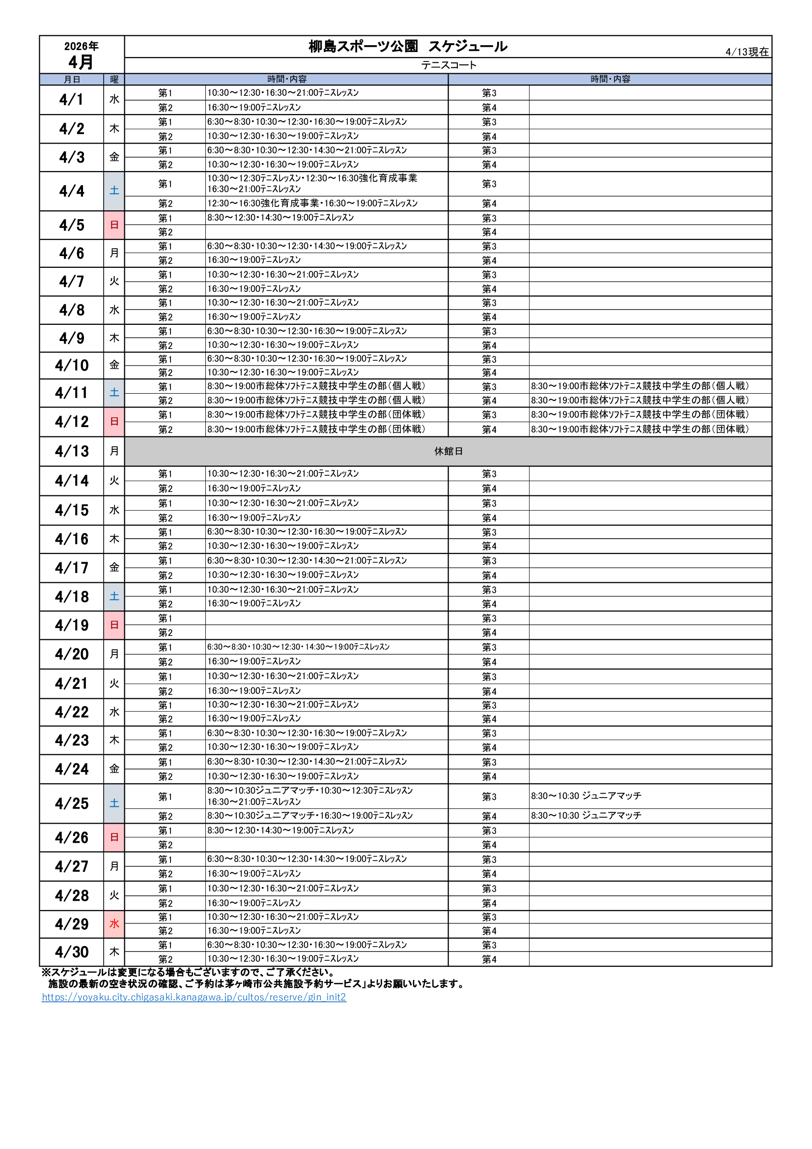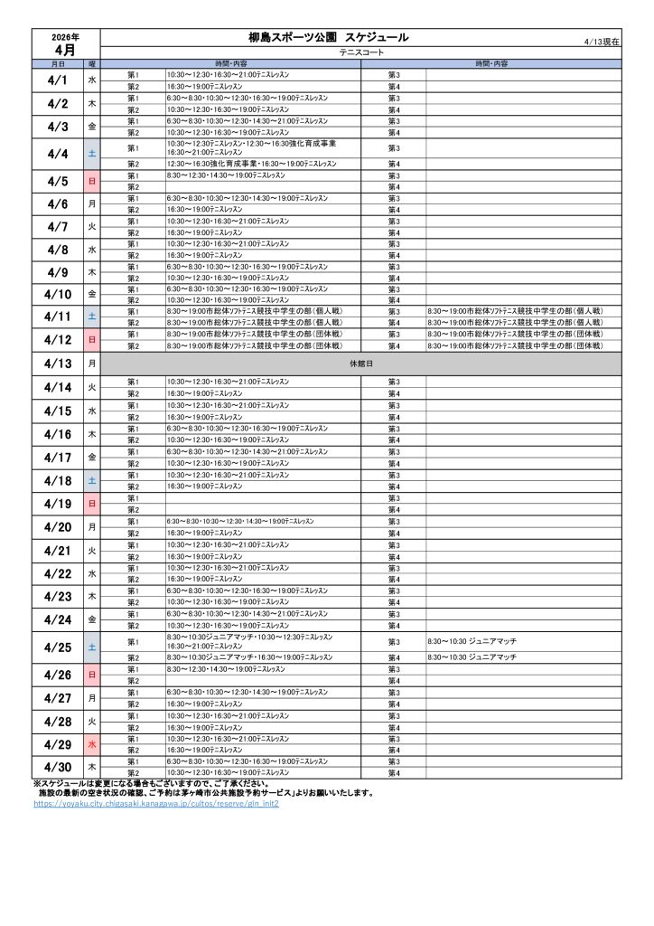 2026年4月のスケジュールになります。