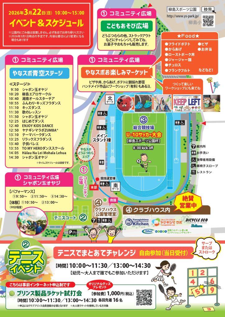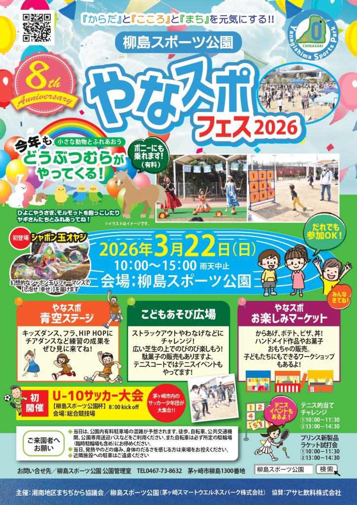 おかげさまで柳島スポーツ公園も開園から8年!今年も恒例の「やなスポフェス2026」を開催します!日時は3月22日(日)10時~15時。
