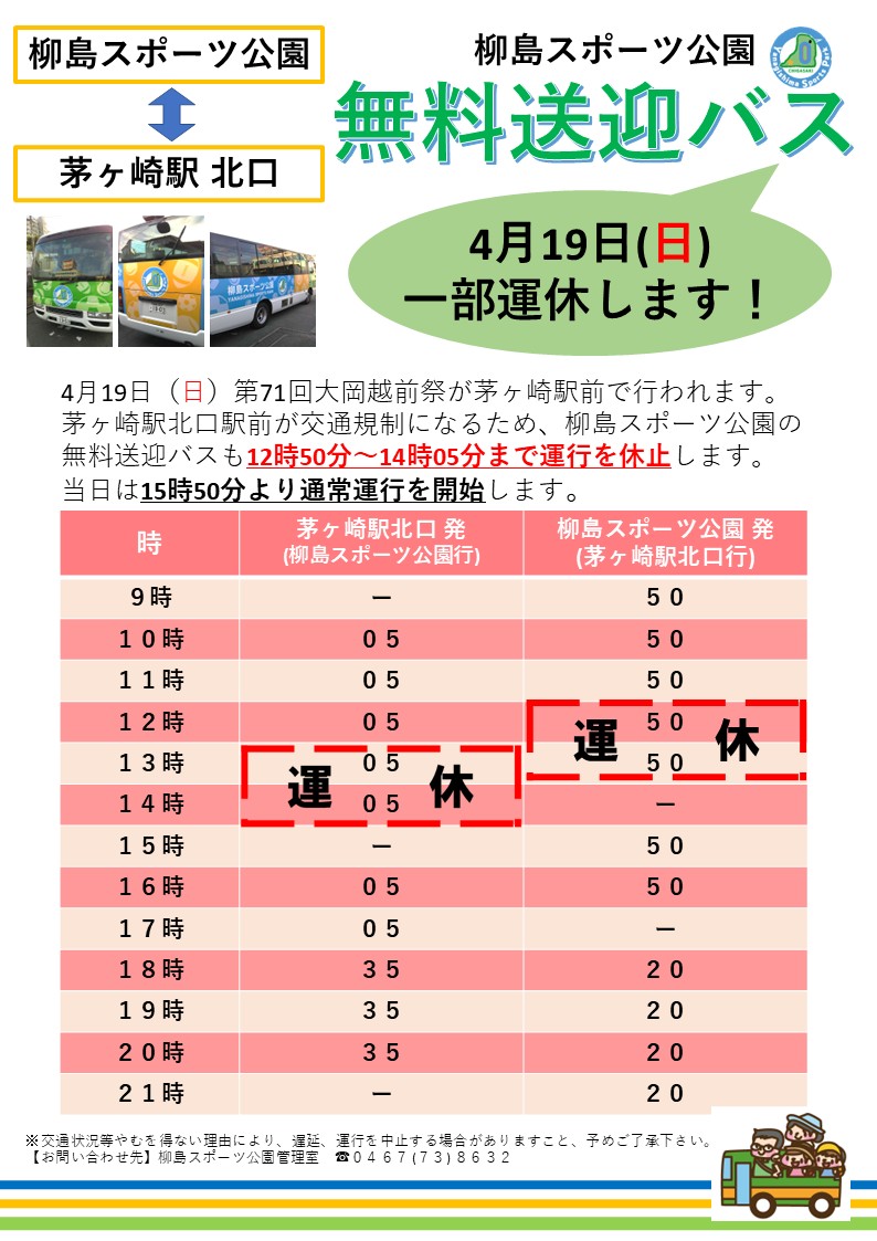 4月19日(日)に第71回大岡越前祭が茅ヶ崎駅前で行われます。 そのため、柳島スポーツ公園無料送迎バスが一部運休となります。 運行時刻にご注意ください。
